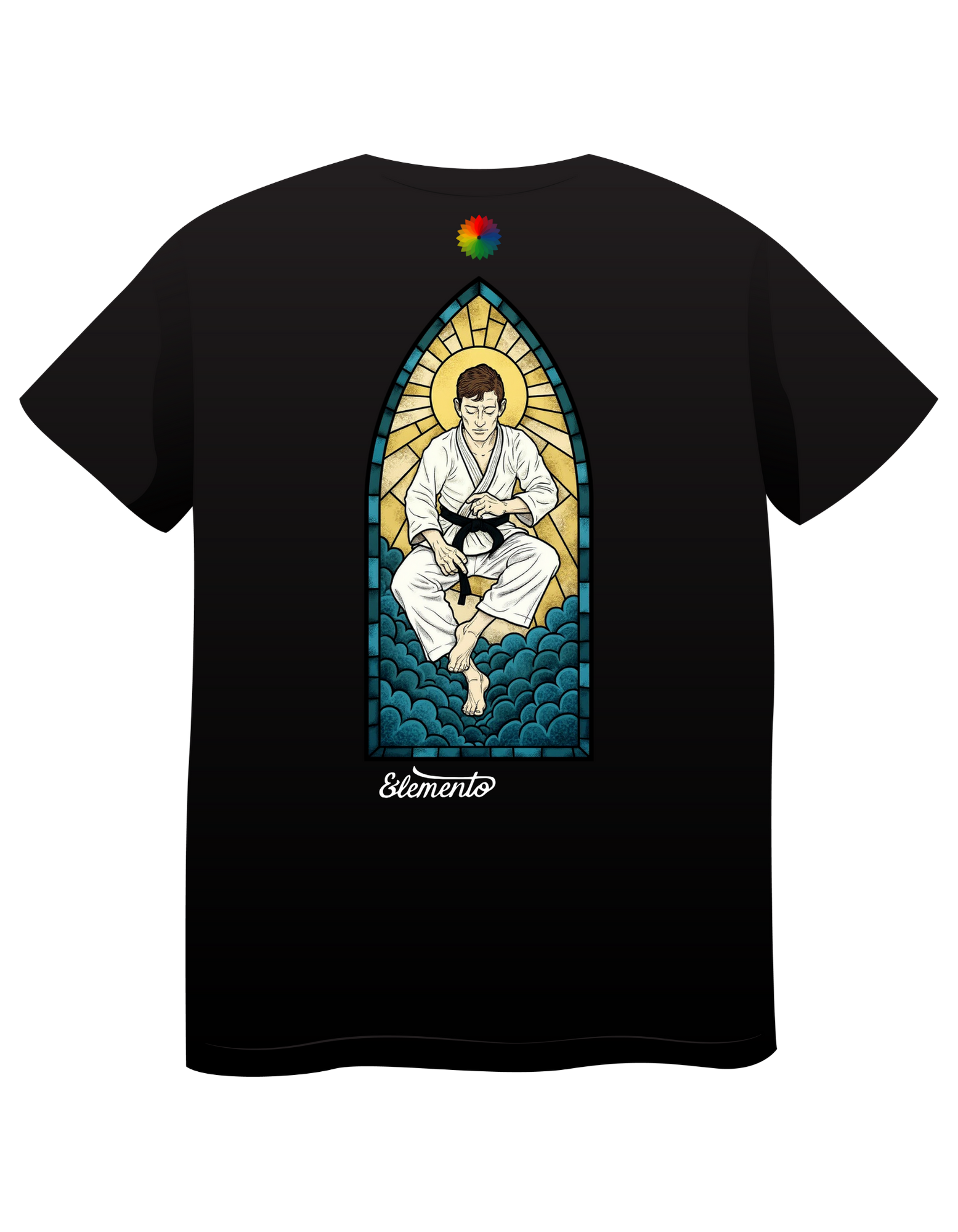 Esta não é apenas uma camiseta – é uma obra de arte wearable que transforma o conceito de vestuário esportivo. O design de vitral nas costas é uma obra-prima visual que eleva o jiu-jitsu ao status de arte sacra que ele sempre foi. O lutador em posição meditativa, cercado por vitrais em tons de azul oceânico e dourado solar, cria uma narrativa visual poderosa: você não apenas pratica jiu-jitsu, você vive uma filosofia. A frente minimalista com apenas o elegante “&” da Elemento mostra sofisticação, enquanto as costas revelam sua verdadeira essência. É storytelling visual no seu auge – discreto na frente, impactante nas costas.